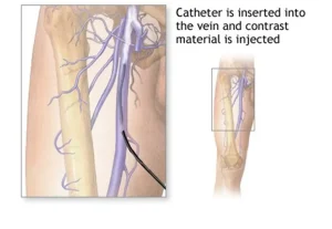 Venography is as study that injects dye into a vein using a catheter that visualizes venous blood flow. As the dye flows through your veins, X-rays are taken. This lets the physician take a look at the condition of your veins, especially in your legs. A venogram can be used to help diagnosed conditions like Deep Vein Thrombosis (DVT). This test takes several minutes, and you can go home the same day of the procedure.